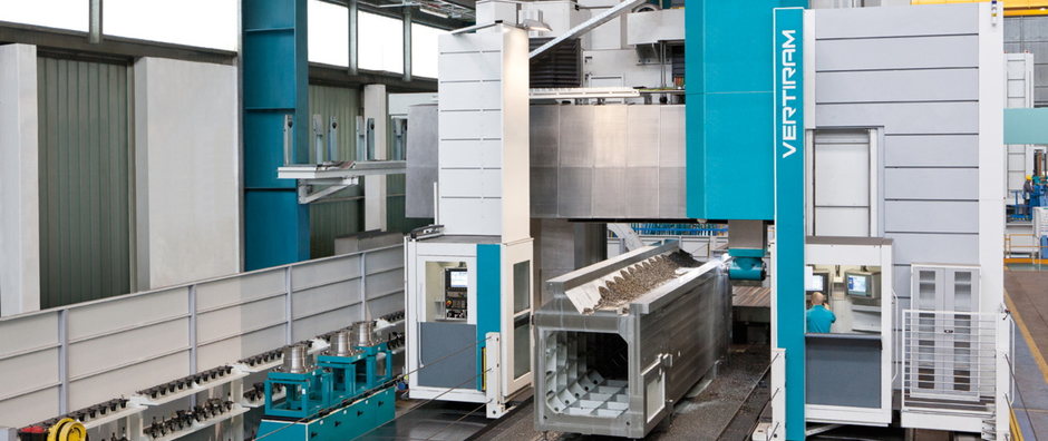 ●Vertiram加工中心系列由五種基本機(jī)型組成,立柱間距從4600mm到6600mm,主軸端面到工作臺(tái)面最大間距從4000mm到5000mm,X軸龍門(mén)移動(dòng)最小行程為6000mm,Z軸滑枕行程為2000mm,W軸橫梁行程從2600mm到3600mm